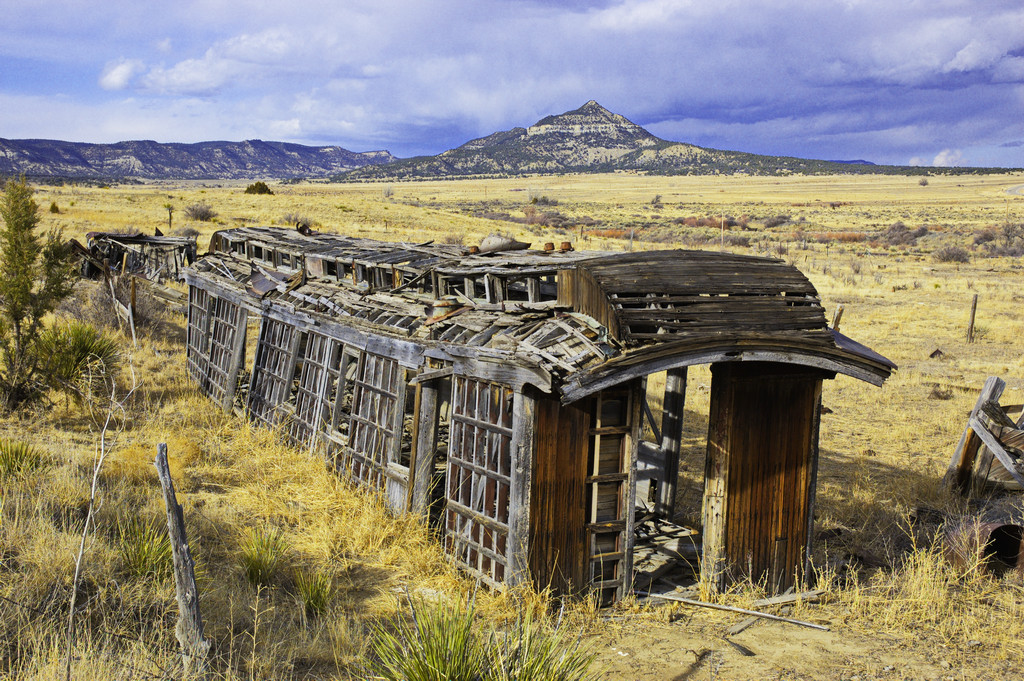 Following my not-unusual habit of not only not taking the road less travelled but following something more akin to two parallel footpaths – south of Raton, north of Maxwell, west of I-25, south of the Canadian River – I came upon this cluster of ruins, the most prominent of which was this old passenger car. Up under the roof – somewhat protected from the sun, wind, and rain – were the barely discernible letters “cific Railw“.