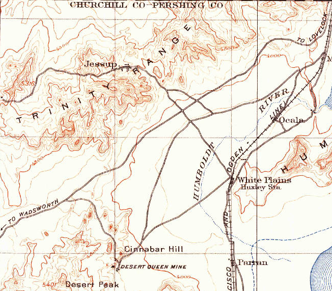 But the Truckee Route was not totally abandoned. Just a few miles west of where US95 cuts off from I-80 were deposits of almost pure salt. By 1864, the area was a significant source of commercial salt, annually producing several hundred tons of salt used in silver ore reduction. When the Central Pacific built past here in 1868, the White Plains station was built here, greatly reducing transportation costs. Prospectors in the area found deposits of silver – the nearby Desert Queen Mine is considered the oldest lode mine in northern Nevada. By 1879, the White Plains settlement had a post office. Salt production started to decrease, the railroad was re-routed to the south, and by 1909, the town of White Plains essentially ceased to exist.