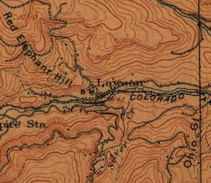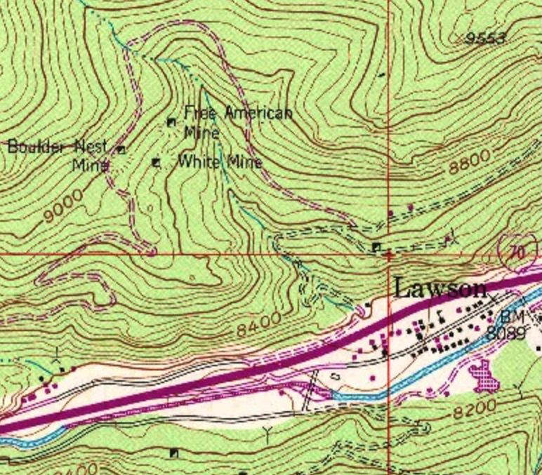 Located just east of the present-day I-70/US40 split west of Denver, local mines were established in the area in 1876. The town was established as "Free America" - a community intended for families. When the Colorado Central Railroad came through in the mid-1870s, a site within Free America was selected for the depot which was named for the landowner, Alex Lawson. The population was about 300 in the 1890s but the collapse of the silver market in 1893 closed the mines and the town began to fade. The construction of I-70 in the 1960s destroyed much of the town and the oldest business - the Anderson store - shut down at the same time. The post office closed in 1966.
