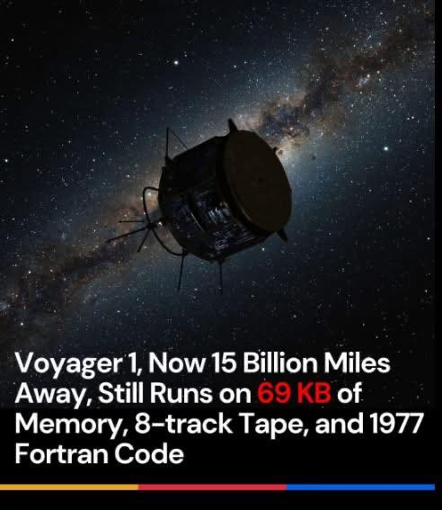 The probe was launched in 1977 with preliminary development starting in the 60s. FORTRAN77 hadn't yet been developed; if FORTRAN, probably a version of FORTRAN IV. The 6 computer system - built of essentially Texas Instrument's 7400 series TTL CMOS (more likely the 5400 series) - has a total of 32k memory made of what could be considered specialized layered PCB traces. And yes, it did have an 8-trak tape recorder - though not of the type found in cars of the late 60s/early 70s.