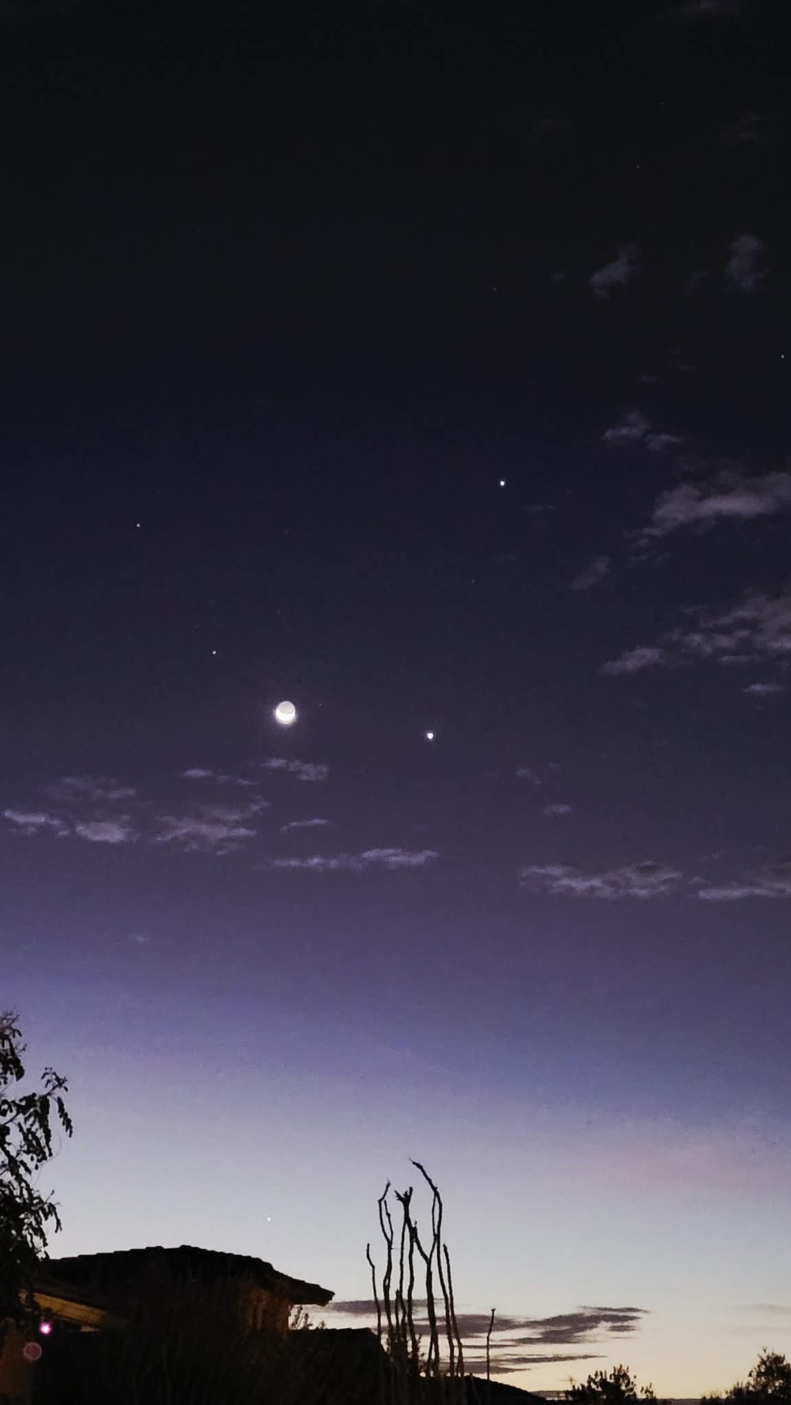 Speaking of celestial sights, I saw this earlier this week as I headed out for my pre-dawn walk. That is a waning crescent moon, and immediately to the moon’s right is Venus. Above and to the right of Venus is Jupiter. If you extend the Jupiter-Venus line down all the way to just above my neighbor’s roof, you can see Mercury. To the left of the moon are the stars Castor and Pollux, which are the two brightest stars of the constellation Gemini.