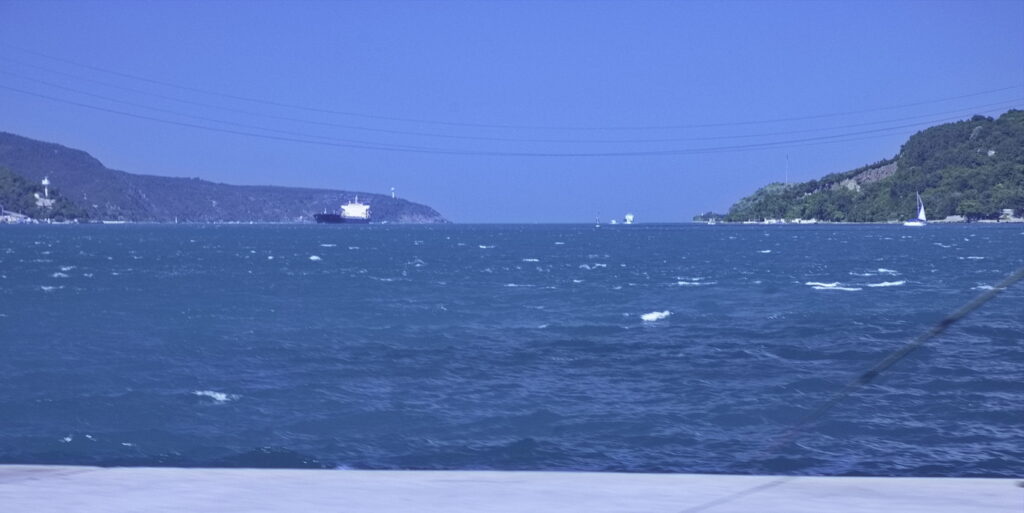 The Bosporus Strait (İstanbul Boğazı), connecting the Marmara Sea to the Black Sea, splits the city of Istanbul (pop ~17million). It lies on the continental divide between Asia and Europe. The strait is about 20 miles long and ranges between a bit less than ½ mile wide to 2 miles wide at the northern end. It has an average depth of about 200 ft extending to 360 ft in places. There is a submarine river through the strait – current can flow in either direction but the primary flow is south to the Marmara.