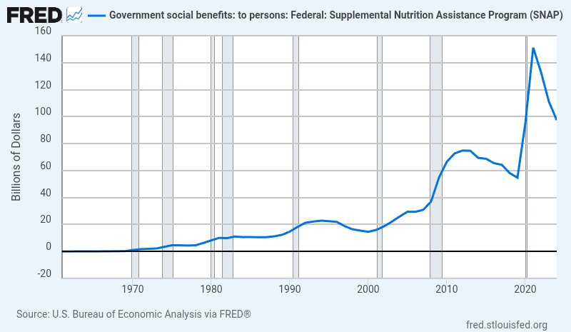 While the numbers are down in recent years, there has still been an incredible increase in the numbers of SNAP recipients. By my eye its something like a 40% increase since 2019. There’s a story here somewhere, but I can’t say that I know what it might be.