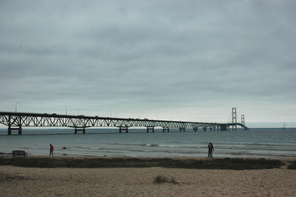 Opened in 1957, the Mac connects the Upper and Lower peninsulas of Michigan across the Mackinac Strait (which connect Lake Michigan to Lake Huron) via 4 lanes of I-75. Mackinaw City (settled 1673; pop about 800) is on the south side of the bridge; St Ignace (settled 1671; pop 2300) is on the north. I-75 extends another 50 miles and ends at Sault Ste Marie at the Canadian border. Mackinac Island is just to the east of St Ignace. Before the bridge was built, ferry service transported traffic across the Strait. Ferry service stopped the day the bridge opened.