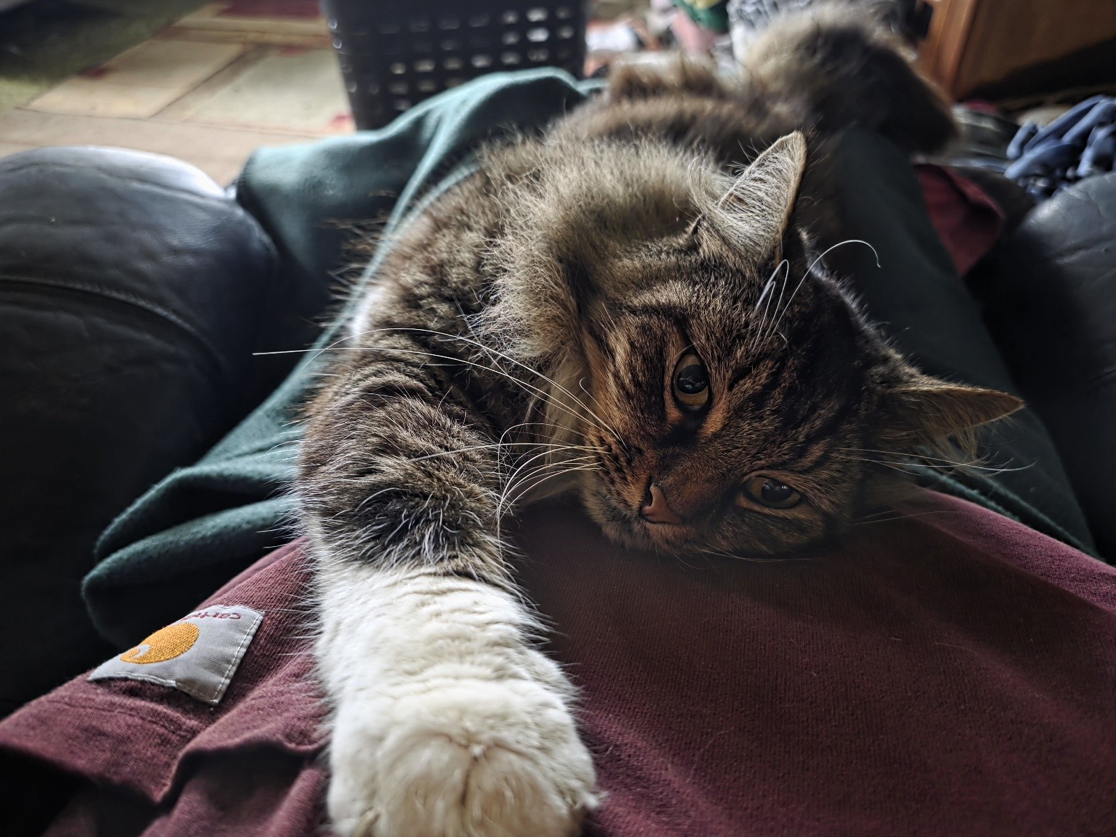 Grey weighs about 15 lbs – he has a brother about 2 lbs heavier. There is no doubt they are an integral part of the family.