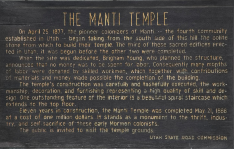 “On April 25, 1877, the pioneer colonizers of Manti – the fourth community established in Utah – began taking from the south side of this hill the oolite stone from which to build their temple“